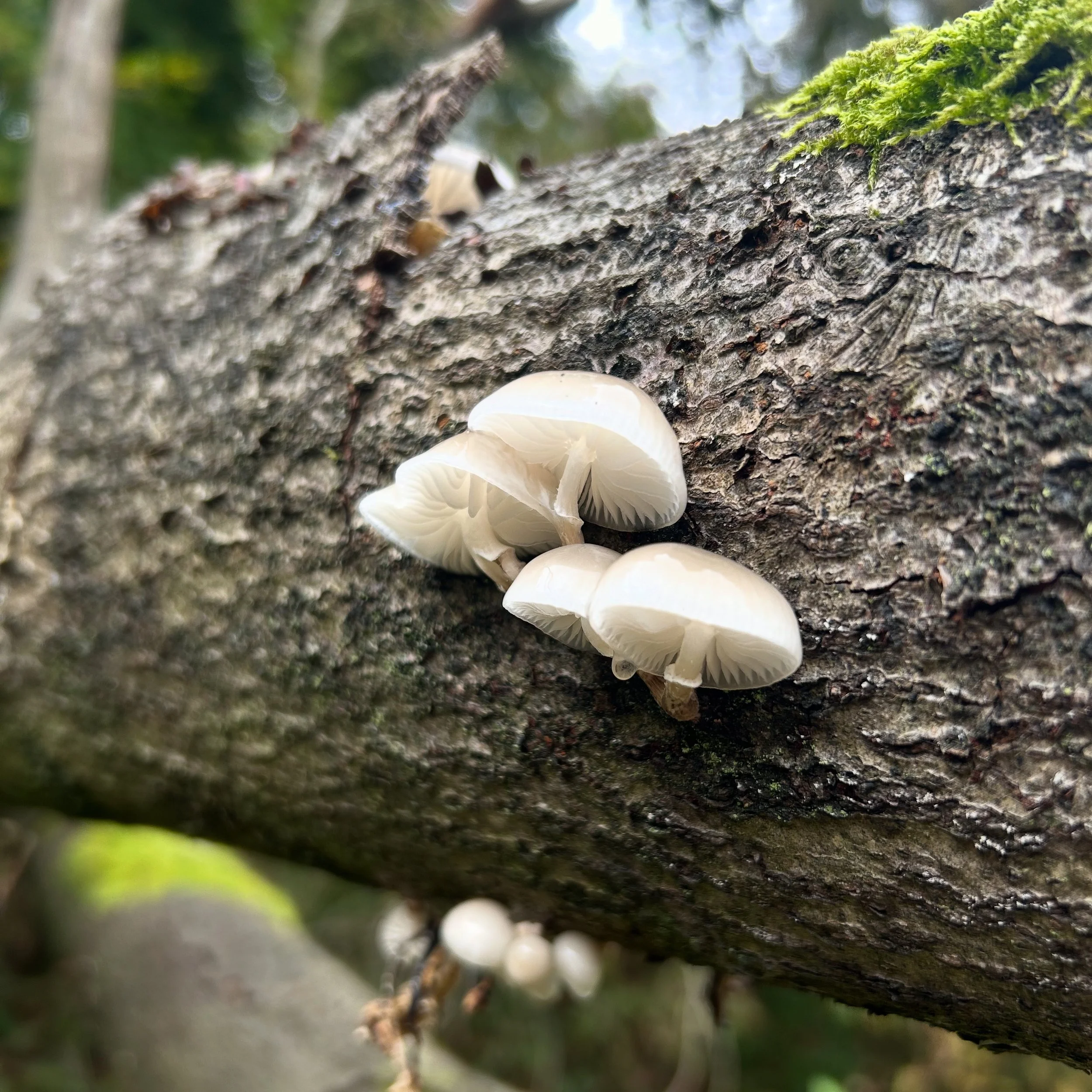 Porcelain fungi are one of my favourites to see in the autumn. With its translucent and shiny caps, broadly spaced gills and slender stems they really do resemble little porcelain parachutes descending from the trees. Only to be found specifically on beech, they are a frequent presence at this time of year on decaying trunks and often dead branches higher up in the crown. They are a very important food source for invertebrates and with their slimy, shimmering caps they can always be relied upon for a decent photograph or two.